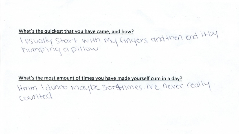 Asia is pretty outgoing with her clothes on, but her shyness increased exponentially with her nudity. She claims to masturbate only a time or two per month, so we may have asked a little much in having her cum twice in one day. Maybe she'll see the wisdom of our ways? :-)
